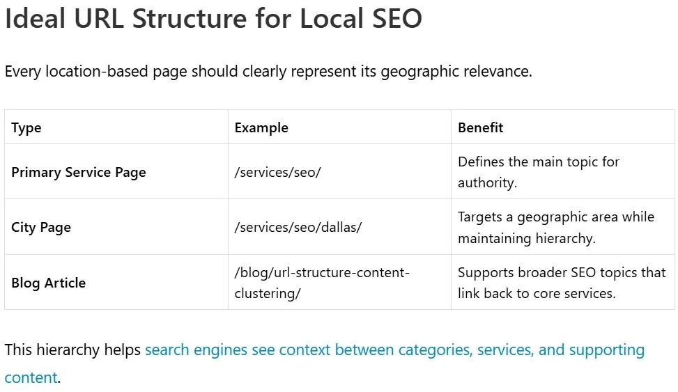 Many businesses focus on keywords and backlinks but overlook how much URL structure and content clustering influence visibility. Together, these elements help organize information, improve crawling, and build local authority across multiple cities.